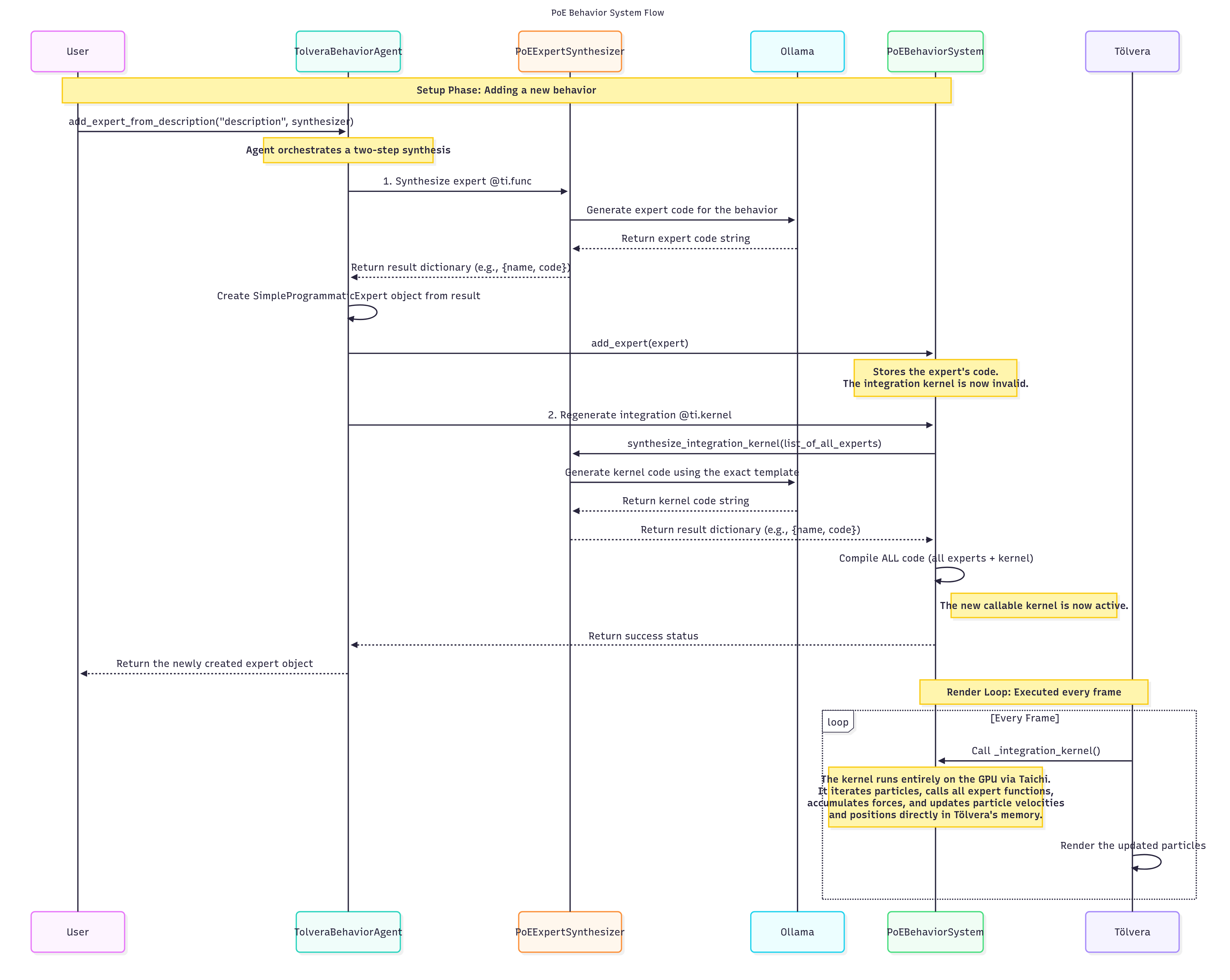 The new PoE architecture represents a pretty significant shift in design philosophy, especially from the arch digram you can see from last week. Instead of attempting to generate monolithic scripts for the whole thing or individual experts that had to generate their entire behavior, the system now synthesizes small, independent “expert” functions. Each expert is a self-contained @ti.func that calculates a specific force (e.g., gravity, replusion, etc). These forces are then aggregated and applied to the particles within a single, main @ti.kernel.